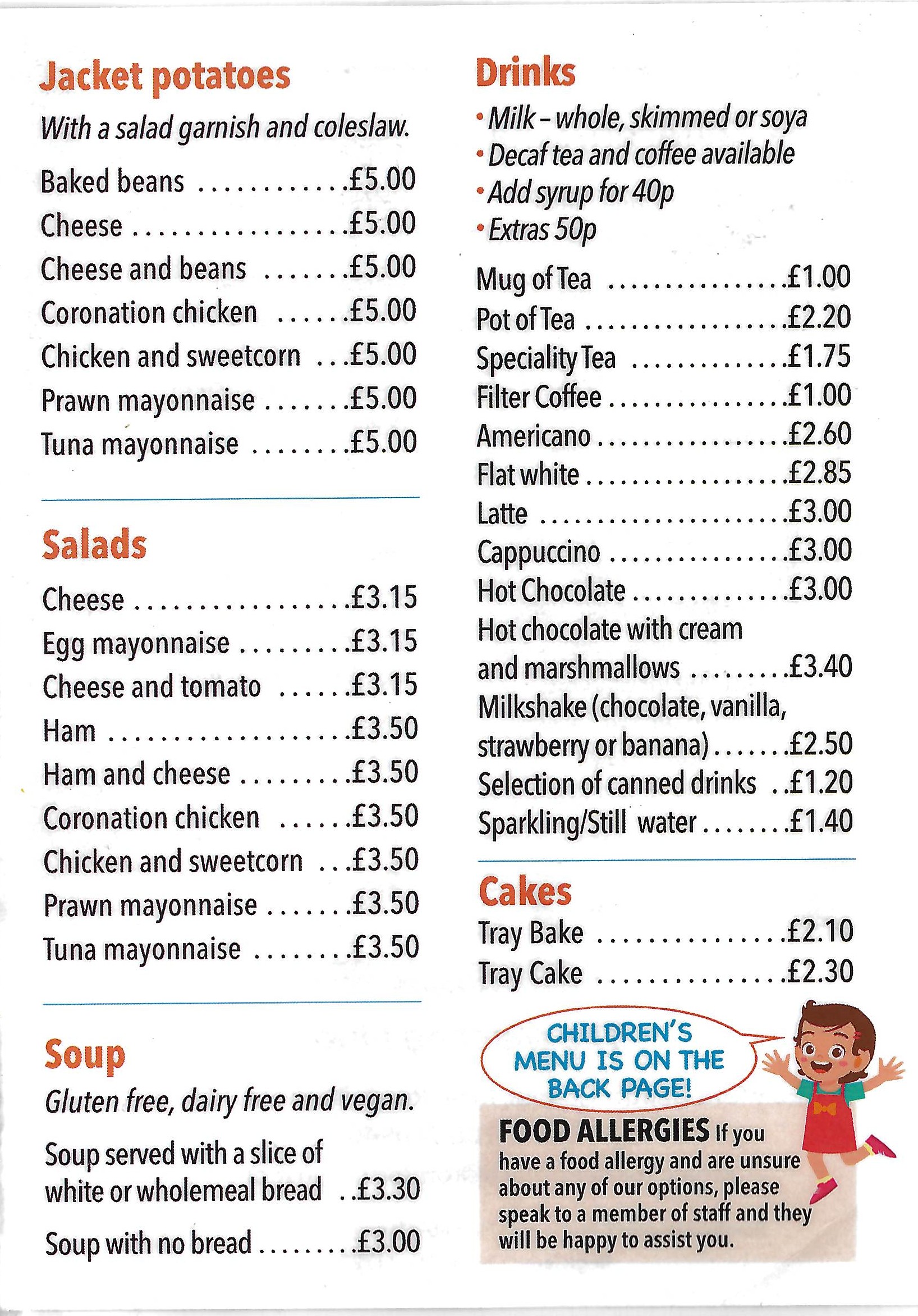 We serve a range of hot and cold drinks including barista coffee, hot chocolate, a selection of teas, milkshakes and canned drinks. Soya milk is available.
